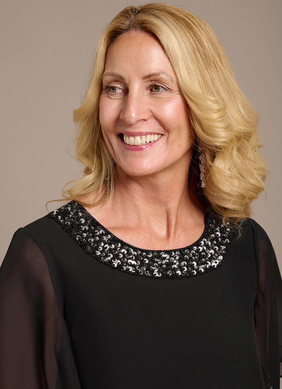 - Éclat Raffiné : Le col rond est magnifié par des applications délicates de perles et paillettes, ajoutant une touche de brillance subtile.
