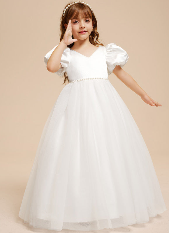 Chaque élément de cette robe a été pensé pour apporter une touche de féerie et de raffinement. Le tissu en satin, doux au toucher, offre un tombé parfait et un léger éclat qui capte la lumière, tandis que les fines perles délicatement appliquées à la taille soulignent la silhouette avec élégance. Le col en V apporte une touche classique et distinguée, et les manches bouffantes, visibles sur l'image, ajoutent un charme innocent et tendance. La coupe longue et ample de la jupe, digne des contes de fées, promet des virevoltes joyeuses et majestueuses. De plus, avec sa doublure complète et ses boutons recouverts dans le dos, cette robe garantit non seulement une esthétique impeccable mais aussi un confort optimal et une finition soignée pour que votre enfant se sente à l'aise et magnifique du matin jusqu'au soir.