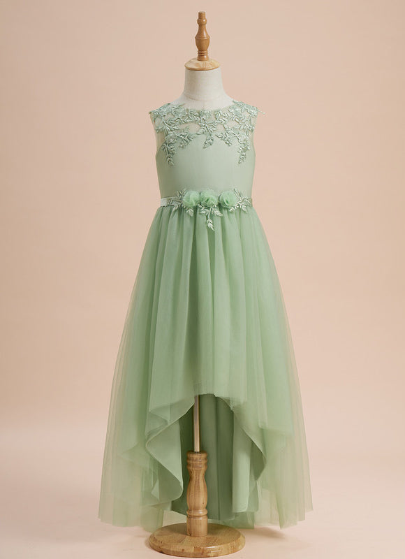 Chaque détail de cette robe a été pensé pour captiver. Le bustier, délicatement orné de motifs floraux 3D en dentelle, apporte une touche de raffinement exquise, comme des petites fleurs qui s'épanouissent sur ses épaules. La taille est sublimée par une ceinture fine, agrémentée de roses en tissu et de feuillages, qui souligne élégamment la silhouette. La jupe trapèze, composée de multiples couches de tulle vaporeux, offre un volume gracieux et une liberté de mouvement idéale pour danser et jouer. Son ourlet asymétrique, plus court à l'avant et plus long à l'arrière, ajoute une modernité discrète et un mouvement enchanteur à chaque pas. Entièrement doublée, elle assure un confort optimal tout au long de la journée.